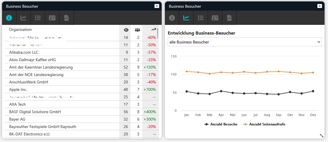 Erhöhen Sie Ihren B2B-Erfolg mit Visual Metrics Erkennung von Business-Besuchern: Identifizieren Sie Unternehmen, die Ihre Webseite besuchen, erhalten Sie Kontaktdaten und passen Sie Ihre Strategie an, um gezielte Leads zu generieren und langfristige Kundenbeziehungen aufzubauen.